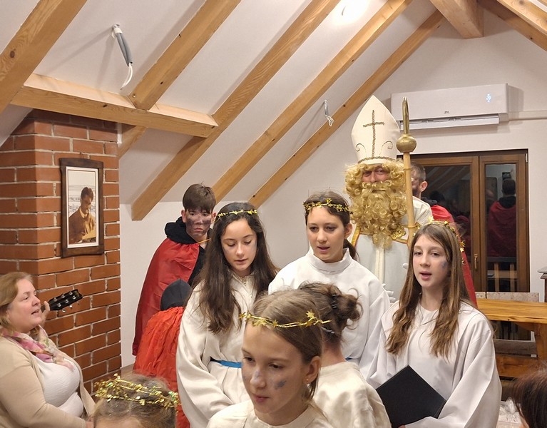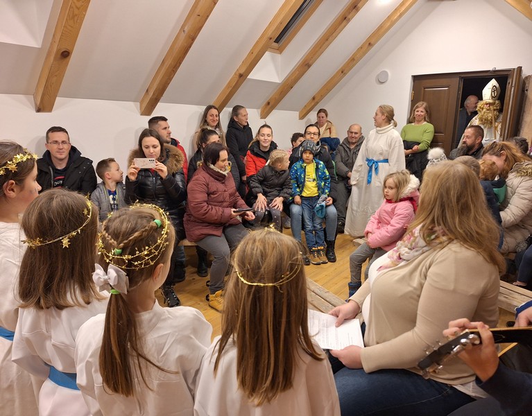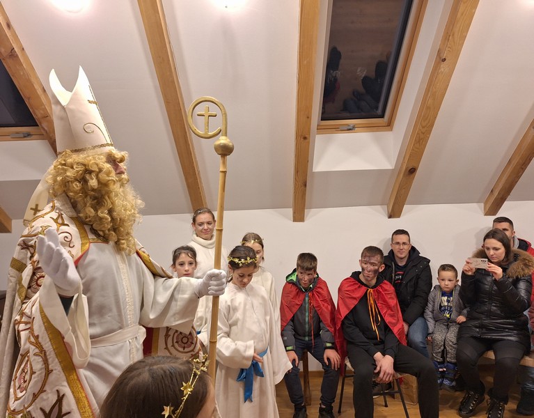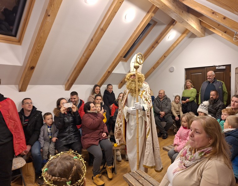 A group of children, led by Petra Jakob Merljak, prepared a short game in which cute little angels and evil little devils with chains performed. They read some letters addressed to Santa Claus and voted on whether the letter writers deserved gifts or not - based on their bad and good deeds this year. Accompanied by Miha Merljak's guitar, they sang a few songs and could hardly wait for Santa Claus to arrive. After greeting the parents and children, the good man gave children some instructive thoughts, then distributed the gifts according to the list. In farewell, the children sang him a few more songs.